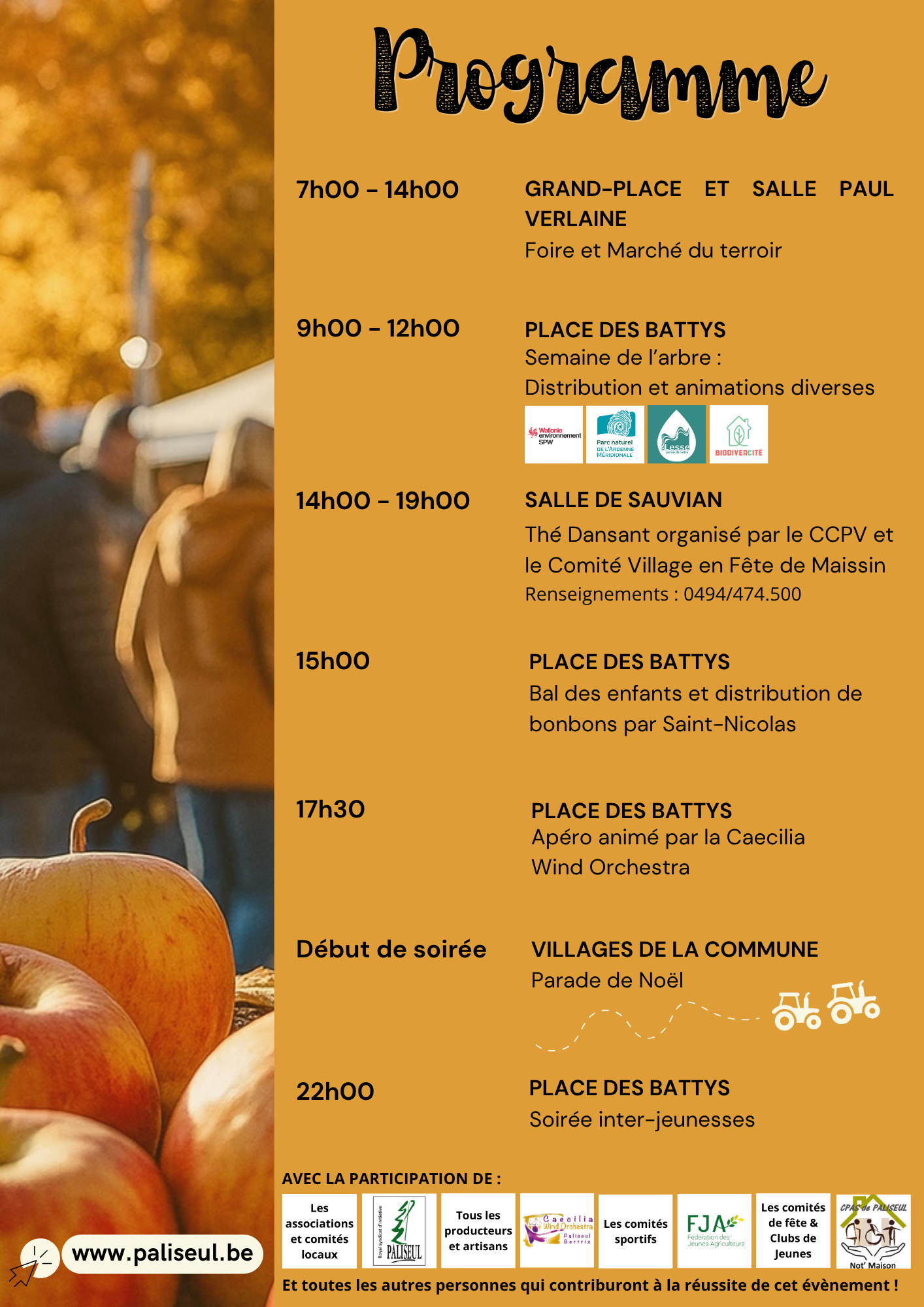 Paliseul s’éveillera dès 7h00 avec la foire et le marché du terroir sur la Grand-Place et dans la salle Paul Verlaine. Producteurs, artisans, camelots, comités...…
